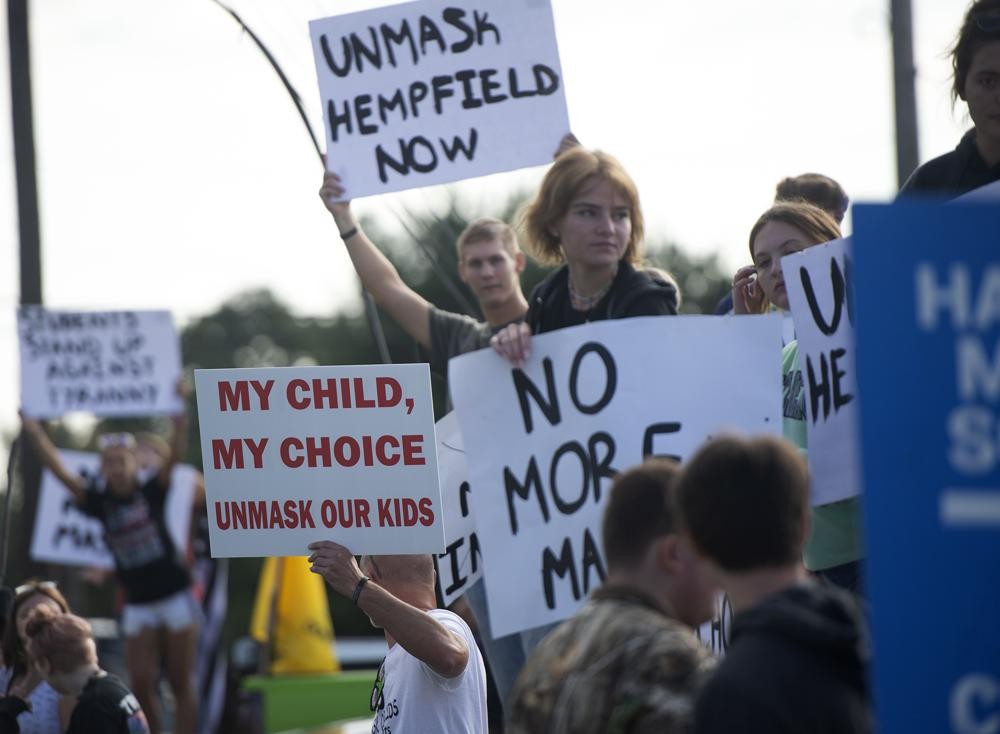 (图说:9月7日,一些学生和家长在宾夕法尼亚州一所中学外抗议强制口罩令。图/AP)