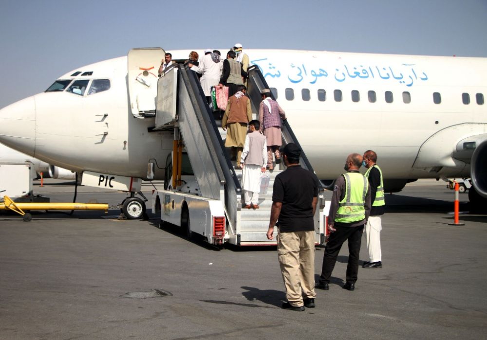 9月6日,人们在阿富汗喀布尔国际机场乘坐阿里亚纳航空公司的航班。(新华社发,塞夫拉赫曼·萨菲摄)