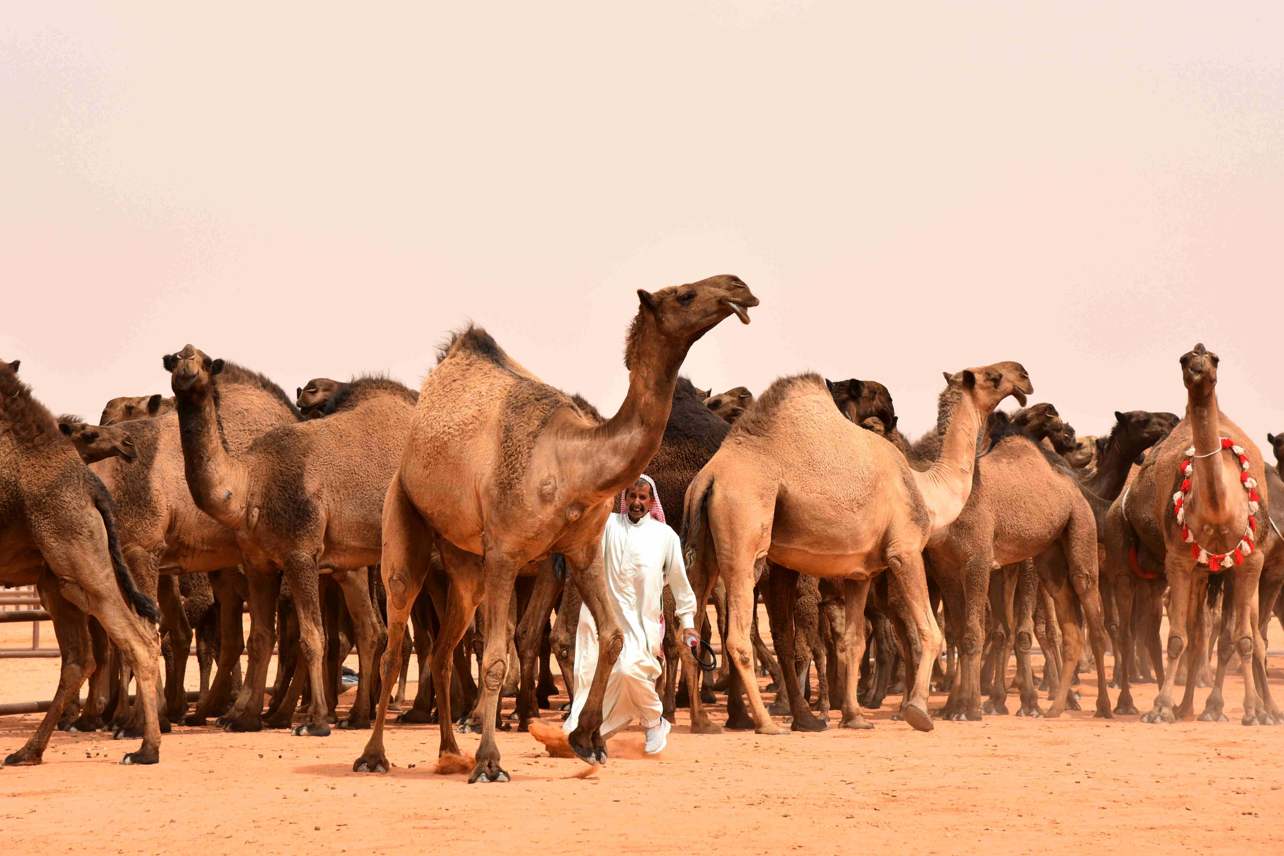 2017年4月4日,在沙特阿拉伯首都利雅得以东的鲁马赫,一名男子带骆驼参加选美。(新华社记者王波摄)
